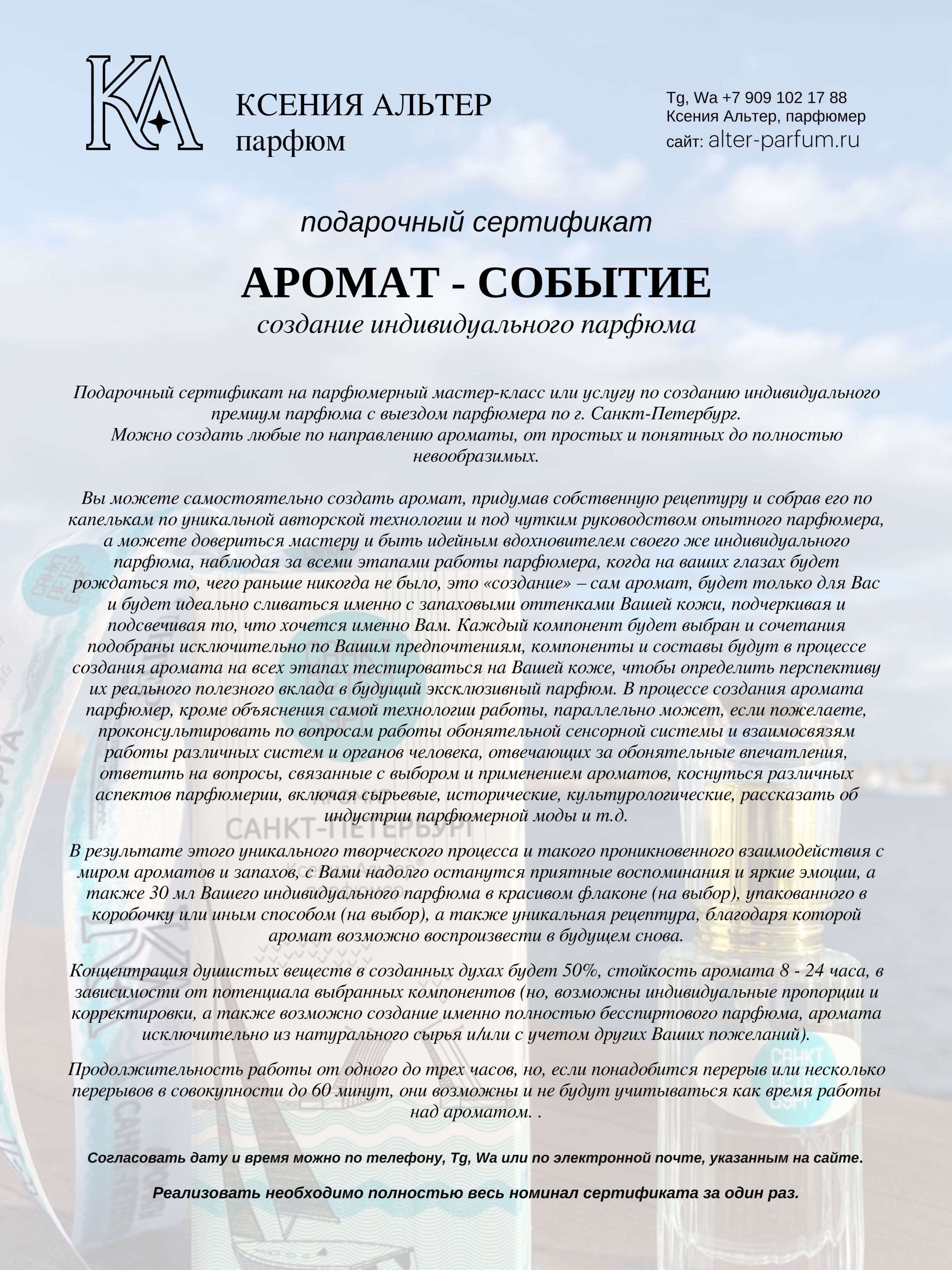 Подарочный сертификат на парфюмерный мастер-класс или услугу парфюмера по созданию индивидуального премиум парфюма, с выездом парфюмера к клиенту по г. Санкт-Петербург. Можно создать любые по направлению ароматы, от простых и понятных до полностью невообразимых.